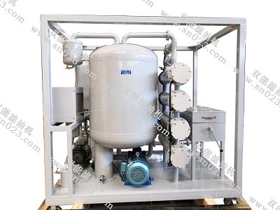 潤(rùn)滑油濾油機(jī)工作時(shí),污染油液在外界大氣壓真空吸進(jìn)的作用下經(jīng)入口進(jìn)入加熱器,加熱后的油液進(jìn)入初濾器,大顆粒雜質(zhì)被濾除,然后油液進(jìn)入分水器,真空分離器,流過特制發(fā)散裝置。該發(fā)散裝置使單位體積的油液產(chǎn)生巨大的表面面積,讓污染油液曝露于相對(duì)濕度很低的真空中,從而清除油中的水、空氣和氣體。蒸發(fā)的水蒸汽、氣體所形成的混合氣體通過水箱和冷卻器冷凝成液體,一同進(jìn)入儲(chǔ)水器,剩余的氣體被真空泵抽出。除去水分的油液被排油泵輸入精濾器除去微粒雜質(zhì),即為凈化油,完成一個(gè)凈化過程,根據(jù)含水量的多少,須多次循環(huán)才能完全除去水分。