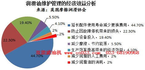 “英國摩擦潤滑協(xié)會”的分析表明,生產(chǎn)效率的提高與減少設(shè)備投入是潤滑油濟效益提升的重要環(huán)節(jié)。此外,減少潤滑油的消耗也能有效地提升潤滑油的經(jīng)濟效益。潤滑油濾油機正是擔當著恢復油品性能,減少油耗的這一角色。