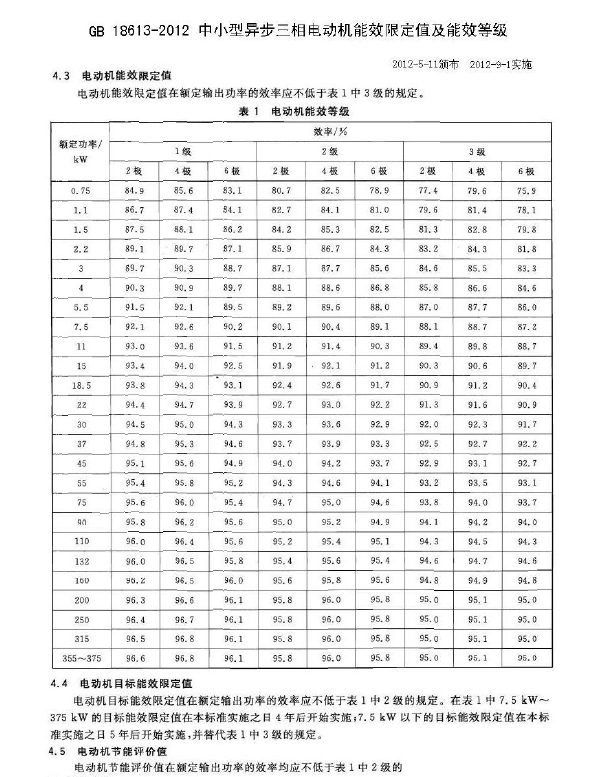 但是到了2012年,隨著我國發展與國際化的同步,我們國家又發不了GB_18613-2012_電動機能效限定值及能效等級判斷的標準,如下表